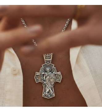 Στον κόσμο των ανδρικών κοσμημάτων, λίγα αντικείμενα φέρουν τη δύναμη του συμβολισμού όπως ένας χειροποιημένος σταυρός διπλής όψεως. Αυτή η εξαιρετική δημιουργία από ασήμι υψηλής ποιότητας, με βάρος 44 γραμμάρια και διαστάσεις 55 x 32 mm, αποτελεί μια σύγχρονη ερμηνεία της βυζαντινής κληρονομιάς.Η πρώτη όψη του σταυρού παρουσιάζει μια ιερή σύνθεση: στο κέντρο, ο Ιησούς Χριστός με την Παναγία σε μια απαλή αγκαλιά προστασίας. Ο Θεός Πατήρ, γνωστός και ως Παλαιός των Ημερών, βρίσκεται στον άνω βραχίονα, περιβεβλημένος από τριγωνική δόξα που συμβολίζει την Αγία Τριάδα. Στον αριστερό βραχίονα, ο Άγιος Νικόλαος με την επισκοπική του στολή προσφέρει την ευλογία του, ενώ κάτω, ο Άγιος Ιωάννης ο Χρυσόστομος κρατά το Ευαγγέλιο, σύμβολο σοφίας και φωτισμού. Οι σλαβονικές επιγραφές προσθέτουν μια διαχρονική αίσθηση μυστηρίου.Γυρίζοντας τον σταυρό, η δεύτερη όψη αποκαλύπτει τον μεγαλοπρεπή Αρχάγγελο Μιχαήλ με ανοιχτά πτερύγια, κρατώντας την ασπίδα και τη φλογισμένη μαχαίρα του – σύμβολα δύναμης και θείας προστασίας. Η χαρακτική είναι τόσο λεπτή που κάθε λεπτομέρεια ζωντανεύει κάτω από το φως.Αυτό το κόσμημα δεν είναι απλώς ένας σταυρός – είναι ένα ιερό κειμήλιο που συνομιλεί με την ψυχή, ένα έργο τέχνης που φοριέται κοντά στην καρδιά. Προσφέρεται με κορδόνι για καθημερινή χρήση ή με εξαιρετική ασημένια αλυσίδα για πιο επίσημες στιγμές. Είναι το ιδανικό δώρο για εκείνους που τιμούν την παράδοση, την πίστη και την αισθητική αριστεία.