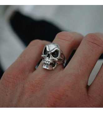 This silver men's skull ring isn't for everyone – it's for those who dare to live on their own terms. This striking piece of jewelry is a hymn to freedom, the passion for the road, and resistance against the conventional. The skull, sculpted with surgical precision in dimensions of 19 x 19 mm, dominates the center of the ring like a manifesto of life. Every detail – from the eye sockets to the teeth and the crown – has been created with such dedication that the piece seems to breathe. Around the skull, symbols and decorative details – weapons, graphic elements, and intricate textures – create a composition that tells stories of a rebel soul. The band of the ring features embossed skulls that continue the theme, while the exceptional quality of the silver guarantees that this piece will accompany you on every adventure. Wear it and declare your place in the brotherhood of free spirits.