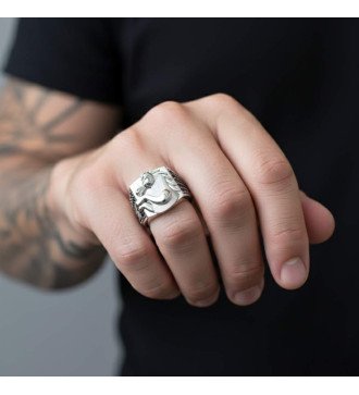 Carry spiritual protection everywhere with you with this stunning silver signet ring featuring the archangel Michael. The detailed depiction of the archangel, with his sword and shield raised, embodies strength and courage. The seal adds a mystical touch, while the sturdy 925° sterling silver construction ensures durability and elegance.This jewellery is more than just a ring; it is a journey into the soul of faith, conveying the powerful presence of Archangel Michael in every movement and glow.