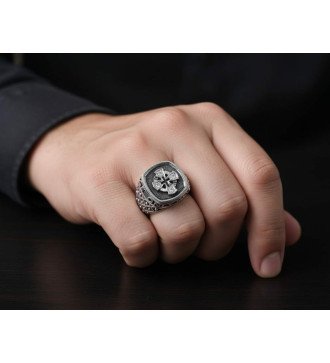 Muestre su estilo personal y su fe con este anillo para hombre que emana antigüedad y exclusividad. Elaborado en plata esterlina, el acabado oxidado agrega profundidad y carácter, creando una sensación de antigüedad e historia. Con detalles que emanan un sentido de reverencia religiosa, este anillo es una conexión personal con la fe y la espiritualidad.El diseño original se destaca por la combinación de la estética griega antigua con el carácter artesanal moderno. Es la pieza de joyería perfecta para expresar fe y añadir un elemento único a tu look. Cómprelo ahora y llévelo con orgullo y estilo.