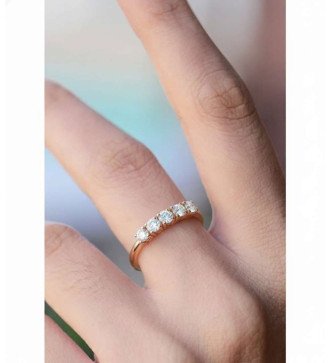 Cuando el amor se convierte en joya, toma la forma de este exquisito anillo de cinco piedras en oro blanco de 14 quilates. Cinco brillantes piedras de circonita blancas adornan la serena superficie del metal, creando una composición que se asemeja a la luz de luna congelada. La sensación del oro blanco en la piel es suave y fresca, mientras que el ancho de 3,5 milímetros ofrece el equilibrio perfecto entre delicadeza y presencia. Cada piedra ha sido engastada con precisión artesanal para reflejar la luz de una manera que encanta desde todos los ángulos. Ya sea elegido como un regalo de aniversario que honra los sueños compartidos, como un símbolo de compromiso con un nuevo comienzo, o como un emblema personal de éxito y autoestima, este anillo es más que una pieza de joyería. Es la expresión física de las emociones que definen los momentos más hermosos de nuestras vidas. Una elección que trasciende el tiempo y se convierte en un tesoro familiar.