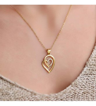 Mostrate il vostro amore in modo intramontabile con questo elegante ciondolo a doppio cuore. Realizzato in argento sterling 925° e placcato in oro giallo lucido, questo gioiello unisce design moderno e romanticismo. Le pietre di zircone bianco che ornano un cuore aggiungono scintille e luce, rendendolo un regalo ideale per San Valentino, per la mamma o per qualcuno che amate veramente. Le dimensioni di 23x15 mm lo rendono elegante e discreto, mentre il design a "doppio cuore" irradia affetto, legame e impegno eterno 💖 Un regalo che sarà amato per sempre.