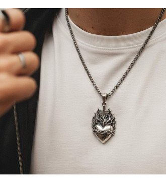 Scopri il potere della fede con questo splendido ciondolo a forma di cuore da uomo in argento sterling 925 ossidato. Un gioiello che combina il simbolismo cristiano con un'estetica rock: il cuore fiammeggiante con la corona di spine e la croce emana passione, sacrificio e devozione eterna. Ogni dettaglio è scolpito con assoluta precisione: le fiamme realistiche che avvolgono il cuore, la corona di spine che simboleggia il martirio di Cristo e la croce che si erge con orgoglio. La tecnica di ossidazione aggiunge profondità e carattere, creando un'estetica vintage che si distingue. Con dimensioni di 40x20mm, è la dimensione ideale per fare una dichiarazione senza essere eccessivo. Disponibile con un cordino in pelle o una catena curb in argento, si adatta al tuo stile personale. Indossalo quotidianamente come scudo di fede o in occasioni speciali per esprimere la tua identità spirituale. Un gioiello che non è semplicemente un accessorio: è una dichiarazione dell'anima!