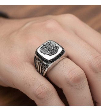 Laat je mannelijke karakter zien met deze luxe herenring!!!!Deze herenring is een luxe en geoxideerd sieraad dat indruk op je zal maken met zijn detail en betekenis. De ring is gemaakt van hoogwaardig zilver en heeft een uniek ontwerp met een tweekoppige adelaar in het midden en zwarte kubieke zirkonia aan de zijkant. De tweekoppige adelaar is het symbool van Griekenland, orthodoxie en het keizerrijk, en in het midden staat de beeltenis van Sint Joris, de beschermheilige van soldaten en ruiters. De zwarte kubieke zirkonia steentjes voegen schittering en contrast toe aan de ring, waardoor hij opvalt