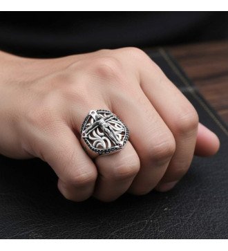 Het is meer dan alleen een sieraad. Het is het harnas van de moderne man. Dit imposante herenring-signet van 30× 25 mm belichaamt de kracht van loyaliteit en onsterfelijke stijl. Het centrum wordt gedomineerd door Jezus Christus aan het kruis, tot in het kleinste detail vervaardigd uit sterlingzilver in een ingewikkeld reliëfontwerp dat doet denken aan Byzantijnse motieven en vlammen. De opvallende zwarte rand van kleine steentjes (zirkoon) voegt een gevoel van mysterie en luxe toe en benadrukt de grootte en het dramatische karakter. Draag hem en voel de geschiedenis, bescherming en onmiskenbare elegantie die alle ogen zullen vangen. Een juwelenring die je niet alleen koopt, maar ook erft. Perfect voor de man die op zoek is naar een sterk, religieus sieraad met een rock- en vintagegevoel.