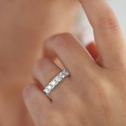 Όταν η αγάπη γίνεται κόσμημα, παίρνει τη μορφή αυτού του υπέροχου σειρέ δαχτυλιδιού σε λευκόχρυσο 14 καρατίων. Πέντε λαμπερές πέτρες ζιργκόν σε λευκή απόχρωση στολίζουν τη γαλήνια επιφάνεια του μετάλλου, δημιουργώντας μια σύνθεση που μοιάζει με παγωμένο φως του φεγγαριού.Η αίσθηση του λευκόχρυσου στο δέρμα είναι απαλή και δροσερή, ενώ το φάρδος των 3,5 χιλιοστών προσφέρει την τέλεια ισορροπία μεταξύ λεπτότητας και παρουσίας. Κάθε πέτρα έχει τοποθετηθεί με χειροτεχνική ακρίβεια, ώστε να ανακλά το φως με τρόπο που μαγεύει από κάθε γωνία.Είτε επιλέγεται ως δώρο επετείου που τιμά τα κοινά όνειρα, είτε ως σύμβολο δέσμευσης σε μια νέα αρχή, είτε ως προσωπικό σύμβολο επιτυχίας και αυτοεκτίμησης, αυτό το δαχτυλίδι είναι περισσότερο από κόσμημα. Είναι η φυσική έκφραση των συναισθημάτων που ορίζουν τις πιο όμορφες στιγμές της ζωής μας.Μια επιλογή που ξεπερνά το χρόνο και γίνεται οικογενειακός θησαυρός.