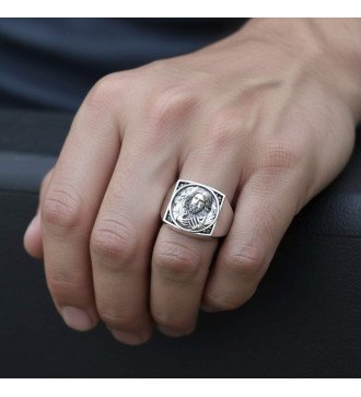 Ontdek het ultieme accessoire dat kunstgeschiedenis combineert met hedendaagse mannelijke elegantie. Deze opvallende zegelring van 21 x 16 mm is een meesterwerk van zilversmeden. Hij is gemaakt van glanzend zilver en valt op door de rijke reliëffiguur van Jezus Christus, een kunstwerk dat grenst aan perfectie. De dichte, Byzantijns geïnspireerde decoratie op de basis en zijkanten van de ring voegt volume, textuur en adel toe. Elke kromming en elk puntje is meesterlijk gegraveerd, waardoor een onmiskenbaar sieraad voor mannen ontstaat dat zijn gelijke niet kent. Het is de keuze van de man die kwaliteit, detail en tijdloze stijl waardeert. Geef het cadeau met een diepe betekenis of verrijk je eigen collectie met een sieraad dat prestige en spirituele volledigheid uitstraalt. Verzeker je nu van dit unieke symbool!